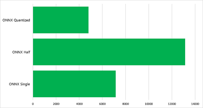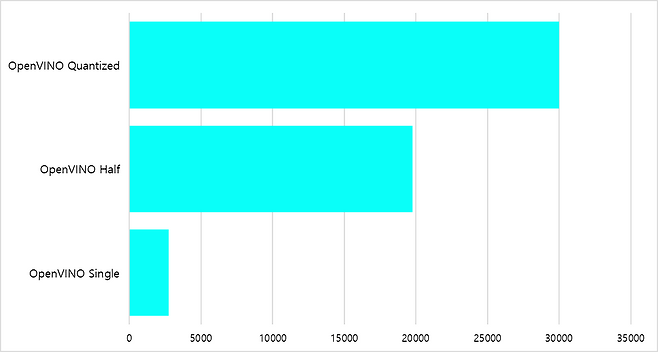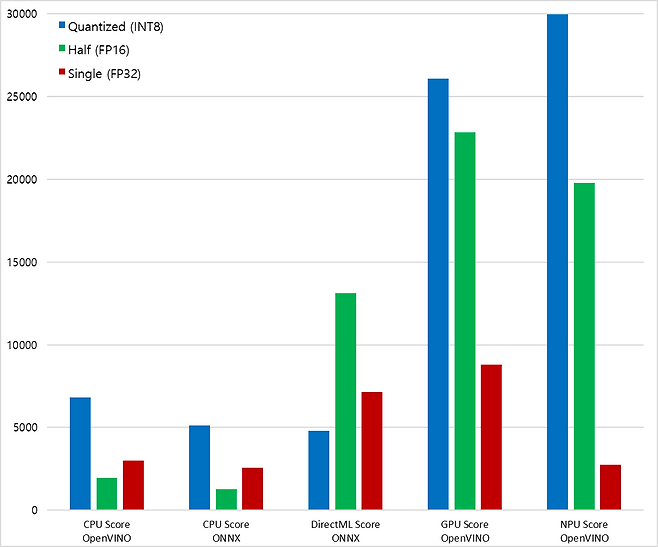 FP16(Half Precision) 연산에서도 OpenVINO는 1966점으로, ONNX의 1271점 대비 54.7% 높은 결과를 보였다. 이는 부동소수점 연산 최적화에서도 OpenVINO가 우수하다는 것을 보여준다. 반면 Single Precision(FP32)에서는 ONNX가 2567점, OpenVINO가 2985점을 기록해, 이번 테스트에서는 OpenVINO가 세 정밀도 모두에서 앞섰다.