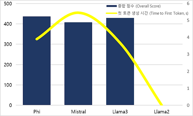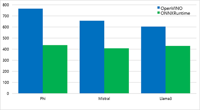 Mistral과 Llama3 모델은 각각 656점, 603점을 기록하며 중상급 성능을 나타냈다. Mistral은 초당 17.545 토큰, Llama3는 15.665 토큰을 생성했고, 첫 토큰 생성 시간은 각각 1.856초, 1.752초로 비교적 빠른 편이었다. 특히 Llama3는 첫 토큰 생성 속도에서는 Mistral보다 앞섰으며, 전체적인 속도와 반응성에서 균형 잡힌 성능을 보여준다. 반면 Llama2는 OpenVINO 환경에서 측정을 실패해 비교 대상에서 제외되었다.