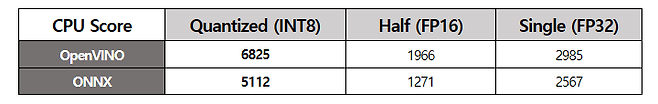 테스트 결과 OpenVINO 백엔드에서 전반적으로 우수한 AI 추론 성능을 보였다. 특히 Quantized (INT8) 연산에서 OpenVINO가 6825점을 기록하며, ONNX의 5112점보다 약 33.5% 더 높은 점수를 기록했다. 이는 OpenVINO가 양자화 모델 최적화에서 강점을 가진다는 것을 입증하는 수치다.