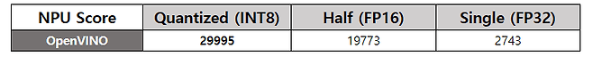 반면, Single Precision(FP32) 연산에서는 2,743점으로 가장 낮은 점수를 기록했으며, Half Precision(FP16)도 19,773점으로 중간 수준에 머물렀다. 이는 NPU가 고정밀 부동소수점 연산보다는 경량화된 양자화 모델에 훨씬 더 특화되어 있음을 나타낸다.