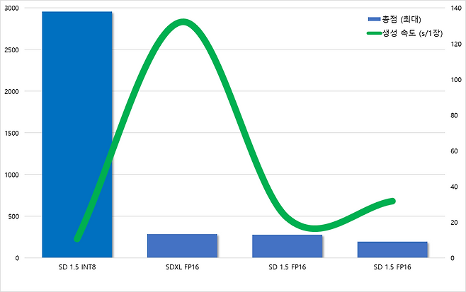 총점 2,953점으로 가장 높은 점수를 기록했으며, 이미지 1장을 10.579초 만에 생성해 속도와 효율 모두 최고였다. INT8은 경량화된 양자화 모델로, 성능 저하 없이 빠른 처리 속도를 제공해 실용성과 휴대성 측면에서도 매우 유리하다.