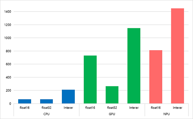 GPU Float32는 종합 점수 229점으로 중간 수준의 성능을 기록했다. 전반적으로 안정적인 결과를 보이며, DeepLab V3(27.38ms), YOLO V3(36.00ms) 등에서 실사용 가능한 속도를 확보했다. 반면, GPU Integer는 점수 62점으로 다소 낮은 결과를 보였으며, 특히 DeepLab V3(569.52ms), YOLO V3(91.62ms)에서 처리 속도가 떨어져 고해상도 모델 연산에는 부적합한 것으로 확인된다.