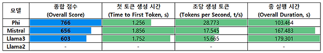 생성 성능을 OpenVINO 환경에서 평가한 결과, Phi 모델이 총점 766점으로 가장 높은 성능을 기록했다. 특히 첫 토큰 생성 시간이 1.256초로 가장 짧았고, 초당 28.773개의 토큰을 생성해 빠른 처리 속도와 우수한 응답성을 보여줬다. 전체 실행 시간 역시 103.464초로 매우 안정적인 결과를 보이며, 벤치마크 전 항목에서 우위를 차지했다.