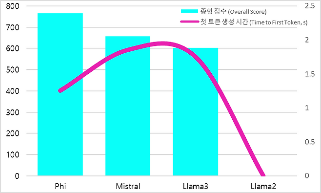 생성 성능을 OpenVINO 환경에서 평가한 결과, Phi 모델이 총점 766점으로 가장 높은 성능을 기록했다. 특히 첫 토큰 생성 시간이 1.256초로 가장 짧았고, 초당 28.773개의 토큰을 생성해 빠른 처리 속도와 우수한 응답성을 보여줬다. 전체 실행 시간 역시 103.464초로 매우 안정적인 결과를 보이며, 벤치마크 전 항목에서 우위를 차지했다.