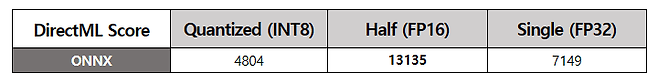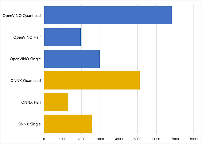 FP16(Half Precision) 연산에서도 OpenVINO는 1966점으로, ONNX의 1271점 대비 54.7% 높은 결과를 보였다. 이는 부동소수점 연산 최적화에서도 OpenVINO가 우수하다는 것을 보여준다. 반면 Single Precision(FP32)에서는 ONNX가 2567점, OpenVINO가 2985점을 기록해, 이번 테스트에서는 OpenVINO가 세 정밀도 모두에서 앞섰다.