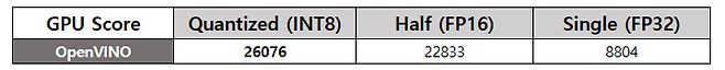 GPU OpenVINO 테스트에서, Quantized(INT8) 연산이 총점 26076점으로 가장 높은 점수를 기록했다. 이는 정수 기반 양자화 모델에서 매우 뛰어난 효율을 보여주는 결과로, 이 하드웨어가 INT8 추론에 최적화되어 있음을 입증한다.