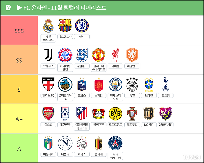 매번 팀컬러 티어리스트를 작성할때마다 아약스, 파리 생제르맹, 나폴리, 이탈리아, 벤피카, 하이프치히 등이 자주 모습을 보인다. 그리고 최근에는 웨스트햄과 뉴캐슬도 은근 많이 모습을 보인다.