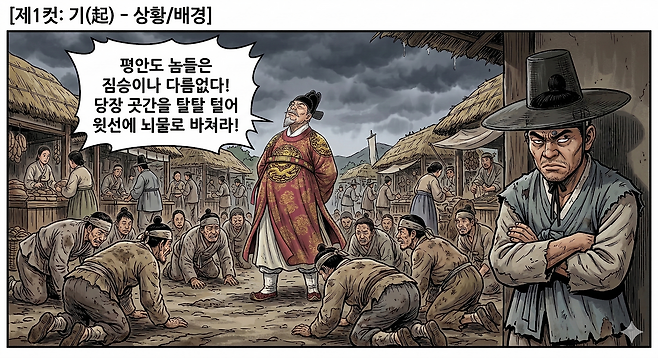 문제는 이 넉넉함이 훗날 끔찍한 비극의 씨앗이 되었다는 점입니다. 당시 조정은 오랜 세월 평안도 출신 사람들을 오랑캐와 가깝다며 무시하고, 300년이 넘는 시간 동안 높은 벼슬길에 오르지 못하게 막았습니다. 철저히 소외된 이 지역 백성들은 출세할 길이 막힌 채 살아갔습니다. 그런데 나라의 살림이 궁핍해지자, 중앙의 썩은 권력자들은 부유한 평안도의 돈을 강제로 끌어다 쓰기 시작했습니다.