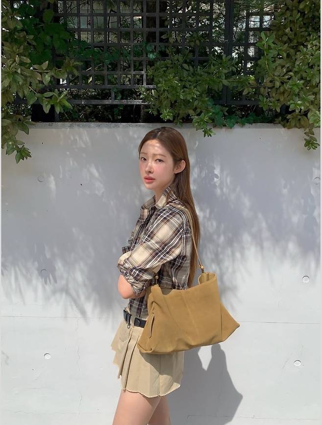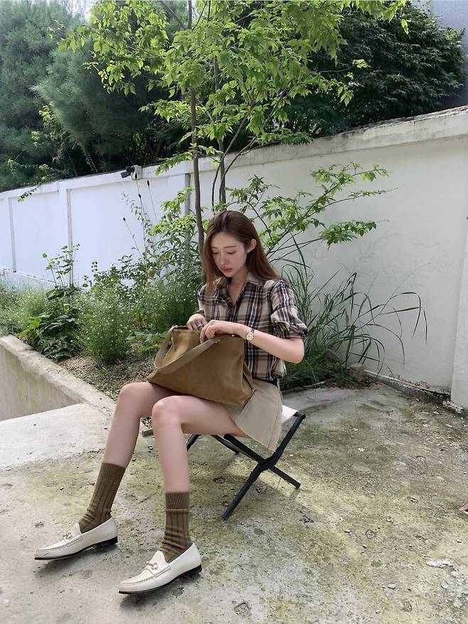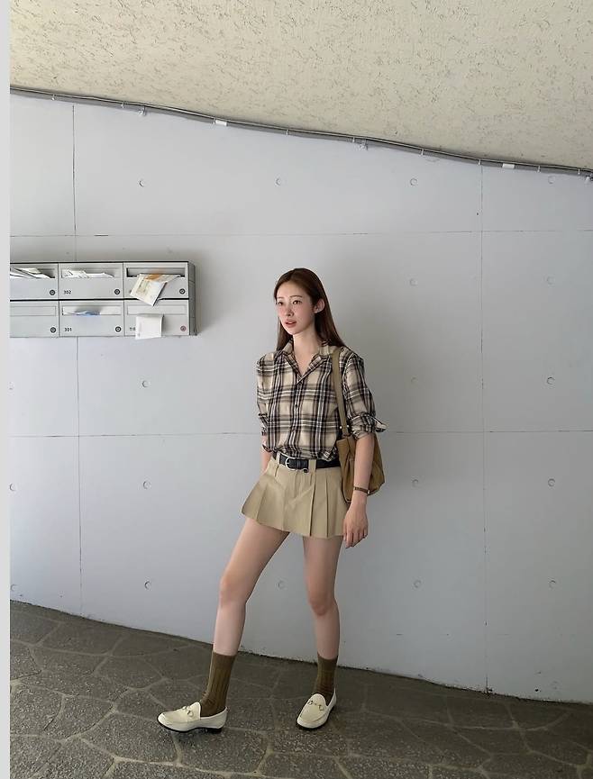 차정원은 클래식한 브라운 체크 셔츠에 베이지 플리츠 미니 스커트를 매치해 단정하면서도 발랄한 분위기를 선보였습니다.