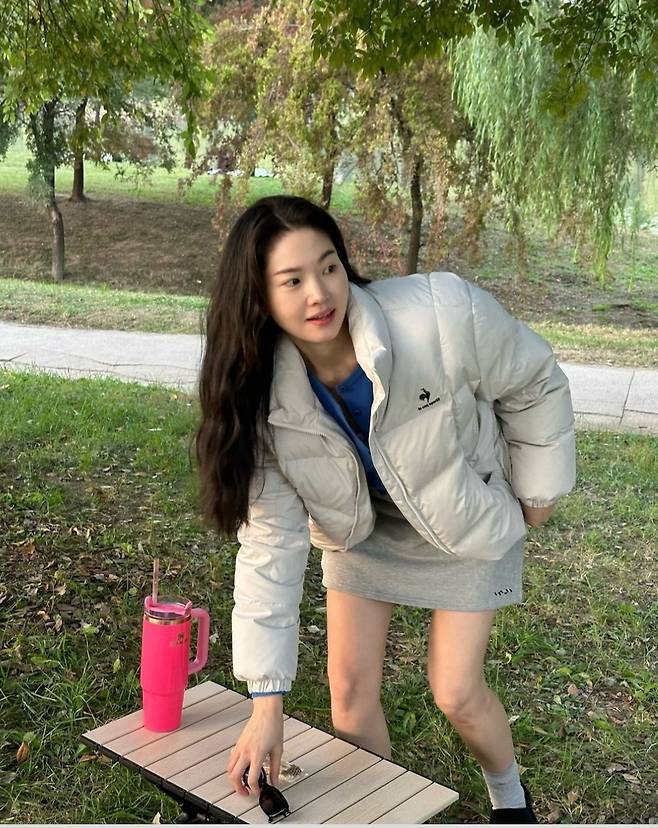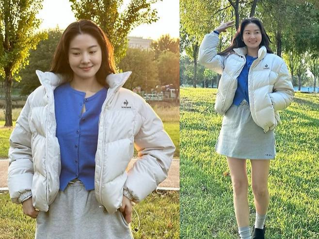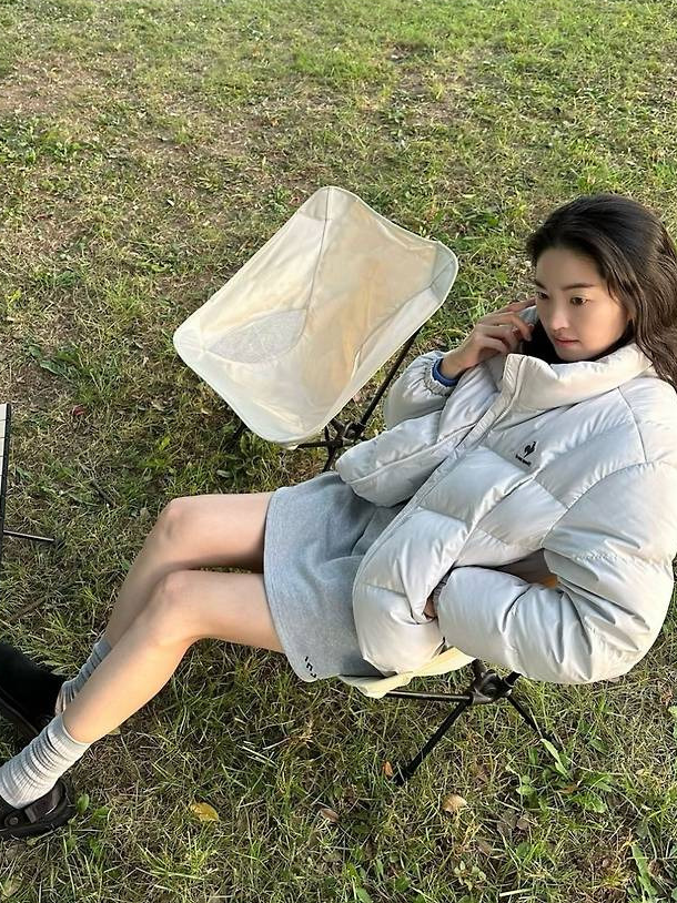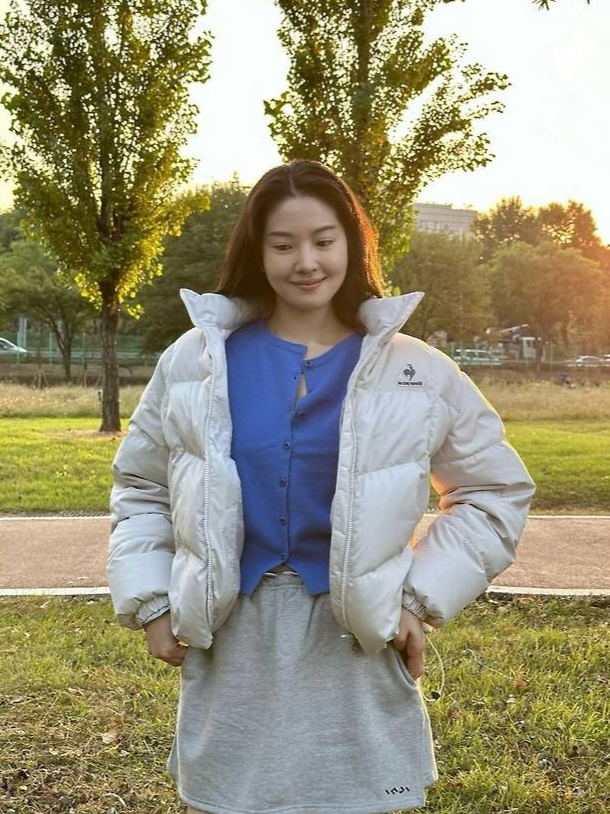 블루 컬러의 카디건과 그레이 스커트를 매치해 청량하고 세련된 무드를 강조했으며, 패딩의 부드러운 컬러가 전체적인 룩을 따뜻하게 감싸주었습니다.