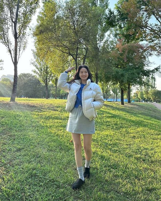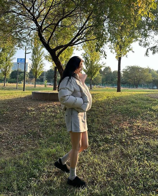 특히 그레이 스커트와 양말, 그리고 블랙 슬리퍼로 캐주얼하면서도 실용적인 패션을 완성하며, 편안한 일상 속에서의 스타일을 완벽하게 연출했습니다.