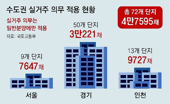 10일 국토교통부에 따르면 실거주 의무를 적용받는 수도권 아파트는 지난달 기준 총 72개 단지, 4만7595채에 이른다. 서울 9개 단지(7647채), 경기 50개 단지(3만221채), 인천 13개 단지(9727채) 등이다. 일반분양만 4786채 규모인 서울 강동구 올림픽파크포레온(둔촌주공 재건축)도 포함된다. 법이 통과되지 않으면서 해당 주택을 분양받은 이들의 상당수는 이사나 자금 계획을 다시 짜야 하는 상황이다.