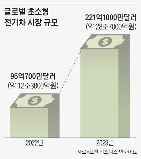 초소형 전기차는 기존 승용차보다는 작고 이륜차보다는 크다. 국내에선 국토교통부가 무게 600kg, 최고 속도 시속 80km, 너비 1.5m, 최고출력 15kW(킬로와트) 이하 차량으로 규정하고 있다. 시장조사 기관 포천 비즈니스 인사이트에 따르면 올해 95억700만달러(12조3000억원)가량이던 세계 초소형 전기차 시장 규모는 2029년까지 221억1000만달러(28조7000억원)로 성장할 전망이다.
