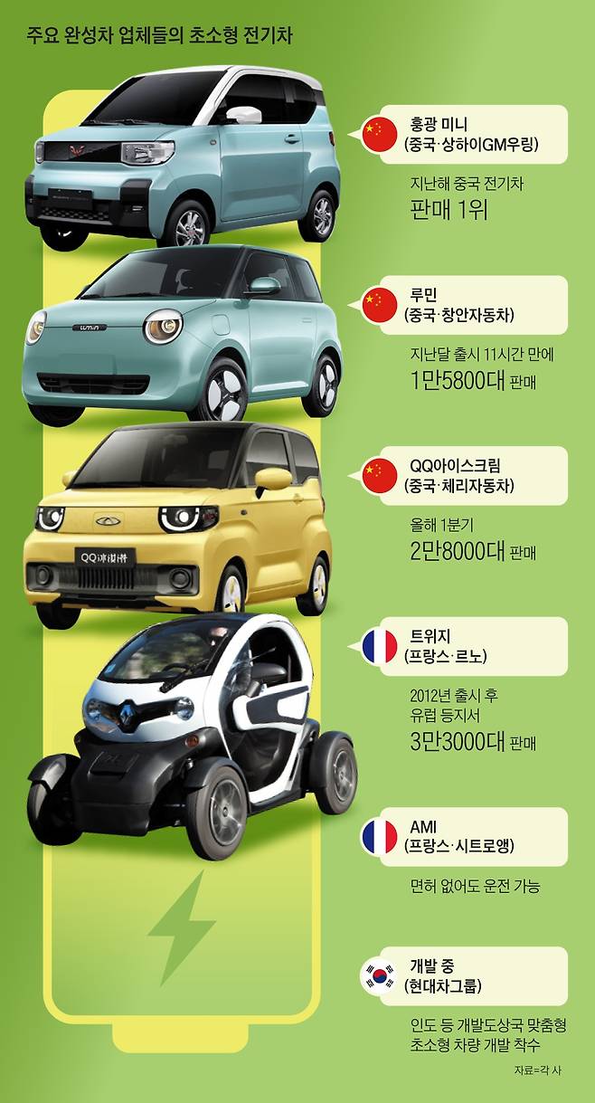 유럽의 완성차 업체들도 초소형 전기차 시장을 꾸준히 두드리고 있다. 2012년 초소형 전기차 시장에 뛰어든 르노는 지금까지 초소형 전기차 ‘트위지’를 3만3000대 이상 판매했고, 시트로엥은 면허 없이도 운전할 수 있는 ‘AMI’를 내놨다. 현대차그룹의 경우 인도 등 개도국 시장 맞춤형으로 소형 전기차를 준비하고 있다. 지난달 현대차 인도 법인의 타룬 가르그 이사는 로이터와 인터뷰에서 “현대차가 인도 시장을 위한 합리적 가격의 소형 전기차 개발에 착수했다”고 밝혔다.