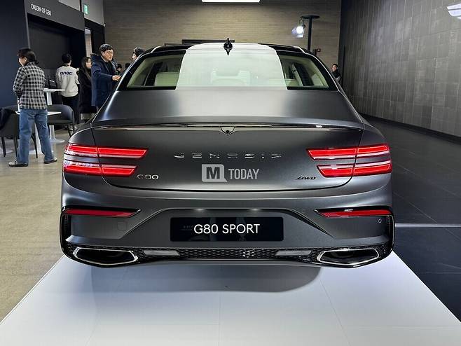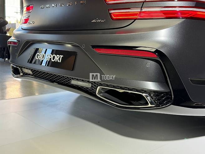 후면부는 리어범퍼 디자인이 GV80 쿠페처럼 다이내믹한 스타일로 변경됐으며, 디퓨저에는 일반 모델의 히든 타입 머플러가 아닌, 제네시스 크레스트 그릴의 디자인에서 착안한 노출형 크롬 듀얼 머플러를 적용해 차별화를 뒀다.