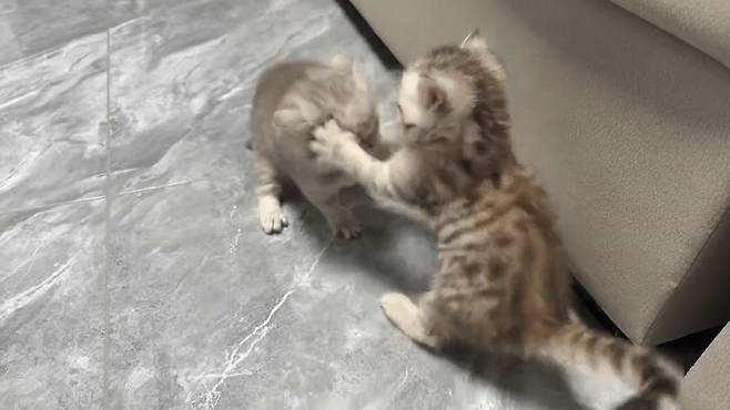 어느 날, 두 아기 고양이는 신나게 놀고 있었습니다. 작은 털실 공을 쫓아다니고 서로에게 장난을 치며 즐거운 시간을 보내던 중, 집안 어딘가에서 갑자기 큰 소리가 울려 퍼졌습니다.