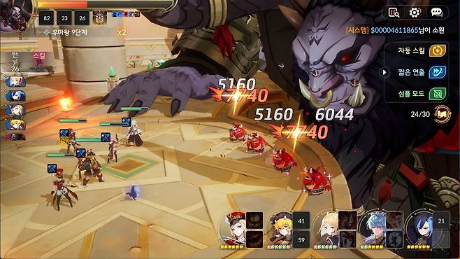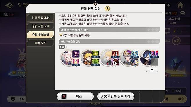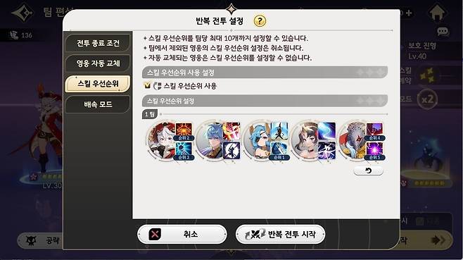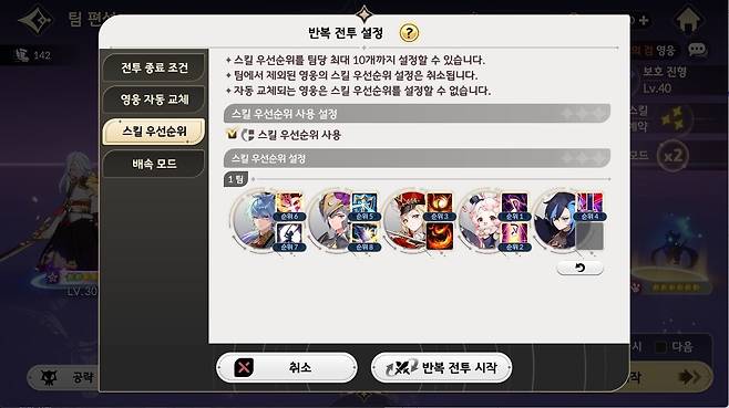 반복 전투 스킬 설정에서는 블랙로즈의 ‘떨어지는 장미’를 1순위로 설정해야 한다. 전투 시작 시 우마왕이 확정으로 ‘분노의 고함’을 사용하며 몬스터를 소환하기 때문이다. 또한 1순위 설정 시, 이후 사용하는 분노의 고함 타이밍과도 딱 맞아 떨어진다. 2순위는 카론의 ‘자연의 숨결’, 3순위에 세인/에스파다 등 딜러의 주력기를 배치하면 된다. 4, 5순위로는 카론의 ‘자연의 회복’이나 에반의 쉴드 등 유지력을 높여주는 스킬을 사용하면 된다.