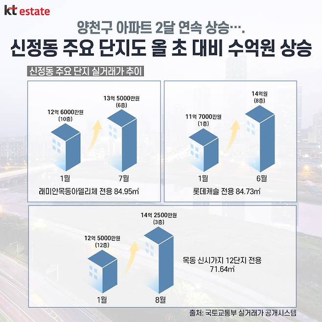 또한, 신정동에 자리한 목동 신시가지 11단지의 경우, 전용 66.24㎡가 지난 2월 11억6700만원(8층)에 거래됐는데요. 8월에는 13억2000만원(13층)에 거래되며 1억5000만원 이상 올랐습니다. 목동 신시가지 12단지 전용 71.64㎡ 또한 1월 12억5000만원(12층)에 거래됐는데, 8월 14억2500만원(3층)까지 실거래되며 단기간에 2억원 가까이 올랐습니다.