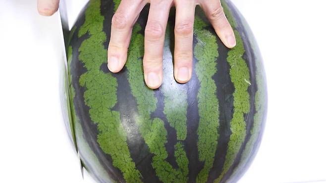 수박을 도마에 껍질이 위로 가게끔 두세요. 그리고 끝 부분은 흰 과육이기 때문에 조금 짧은 길이로 타이트하게 자르세요.