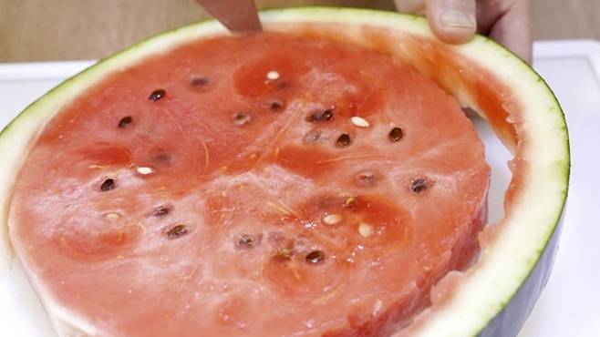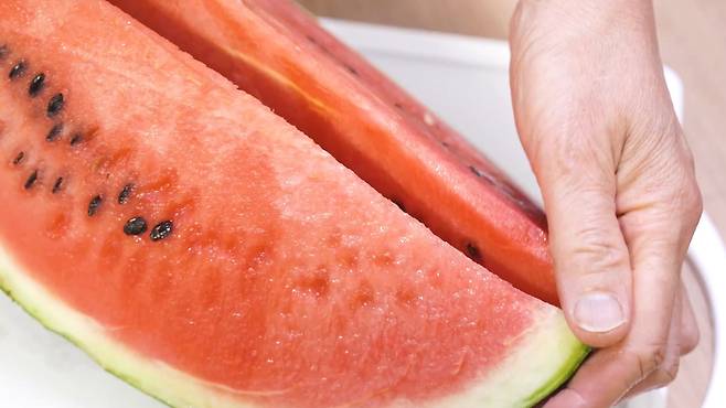 만약 많은 양을 먹기 부담스럽다면, 수박 반통 단면을 손가락 2마디 크기로 잘라 줍니다. 나머지는 냉장고에 보관하세요.