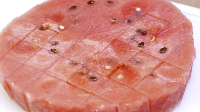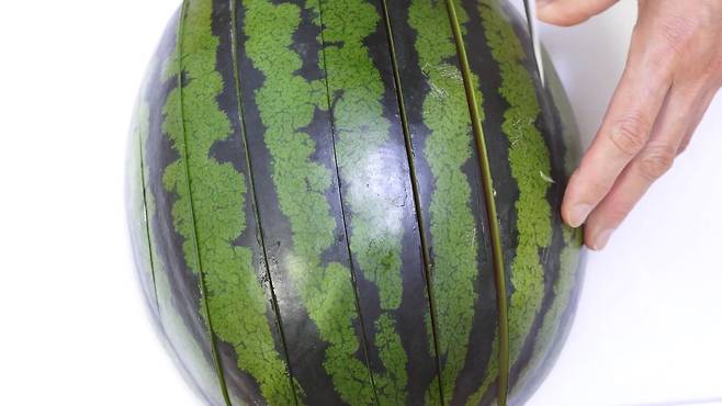 흰 과육까지 수박을 일정한 간격으로 자르세요. 이때 껍질은 자르시면 안 돼요. 그리고 흰색과 붉은색 경계를 칼로 잘라 줍니다.