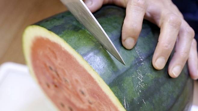 그리고 잘린 단면을 도마에 두고 흰 과육과 붉은 과육 경계를 칼로 자르세요. 이후 일정한 간격으로 깍둑썰기 하면 한번 먹을 분량으로 딱 적당해요. 이렇게 두고 먹으면 수박 물이 빠지지 않아 항상 신선한 수박을 드실 수 있어 좋아요.