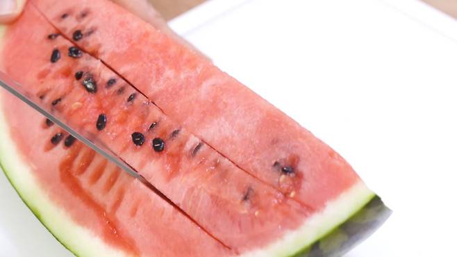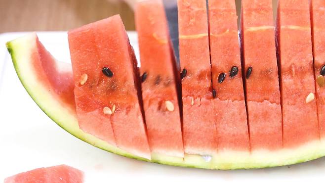 이제 반대편으로 수박을 마찬가지로 손가락 2마디 길이로 썰어 줍니다. 그러면 하나씩 집어 먹기 정말 좋은데요.