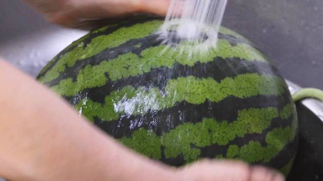 먼저 사온 수박은 물에 깨끗이 씻어 주세요. 자르는 과정에서 균이 과육 안으로 들어갈 수 있기 때문에 겉 표면을 미리 깨끗이 씻는 것이 중요해요.