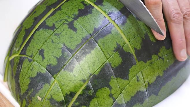 흰 과육까지 수박을 일정한 간격으로 자르세요. 이때 껍질은 자르시면 안 돼요. 그리고 흰색과 붉은색 경계를 칼로 잘라 줍니다.