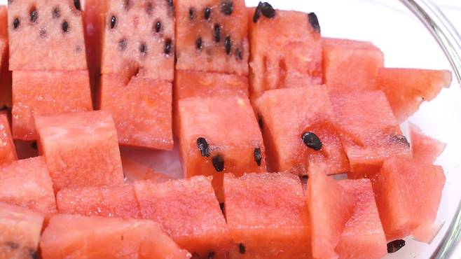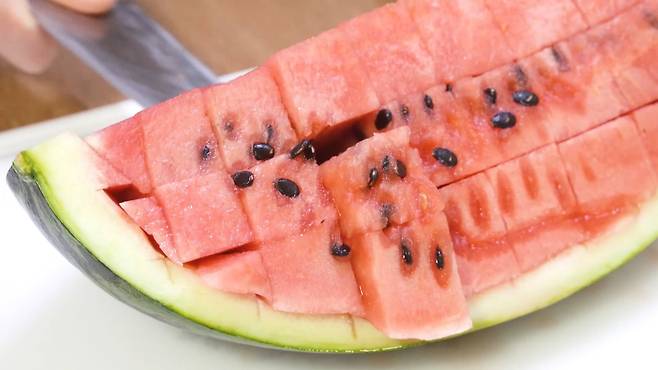 그리고 잘린 단면을 도마에 두고 흰 과육과 붉은 과육 경계를 칼로 자르세요. 이후 일정한 간격으로 깍둑썰기 하면 한번 먹을 분량으로 딱 적당해요. 이렇게 두고 먹으면 수박 물이 빠지지 않아 항상 신선한 수박을 드실 수 있어 좋아요.