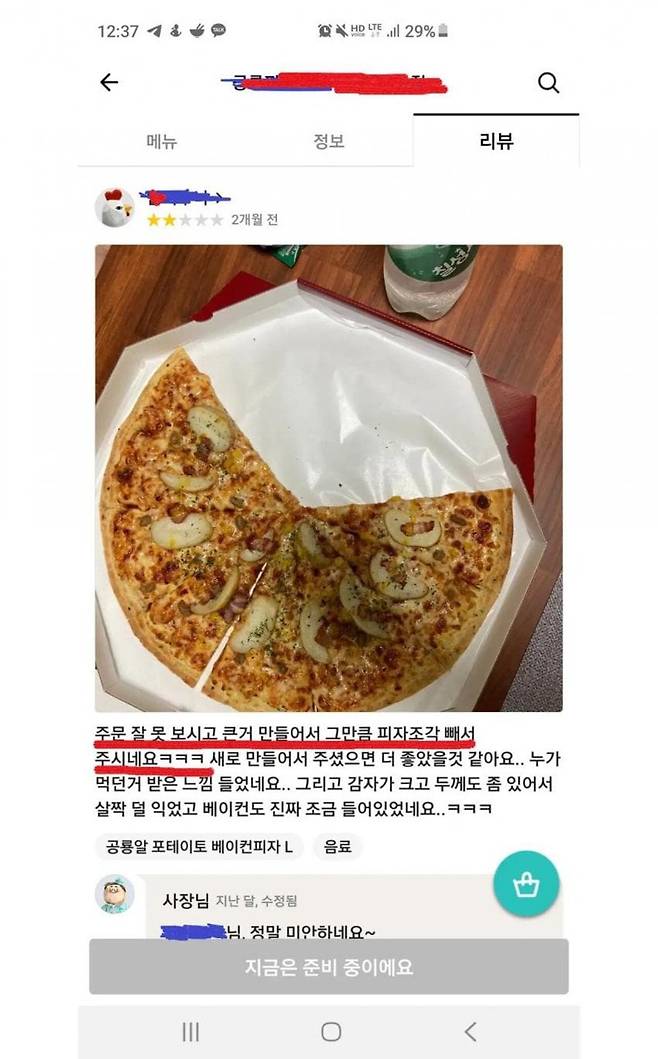 피자 시켰는데 사장이 2조각 빼고 배달해서 논란.jpg