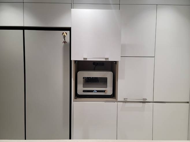 주방장은 삼성 비스포크 냉장고와 큐커가 쏙 들어가게끔 사전 협의하여 제작하였습니다 : ) 삼성 비스포크 오토오픈도어 냉장고(냉동고)는 밖으로 손잡이가 나와있지 않아 더 깔끔한 주방을 연출할 수 있어 좋아요. 아울러 냉장고 문을 열 때 힘을 들이지 않아도 돼서 편하고요.