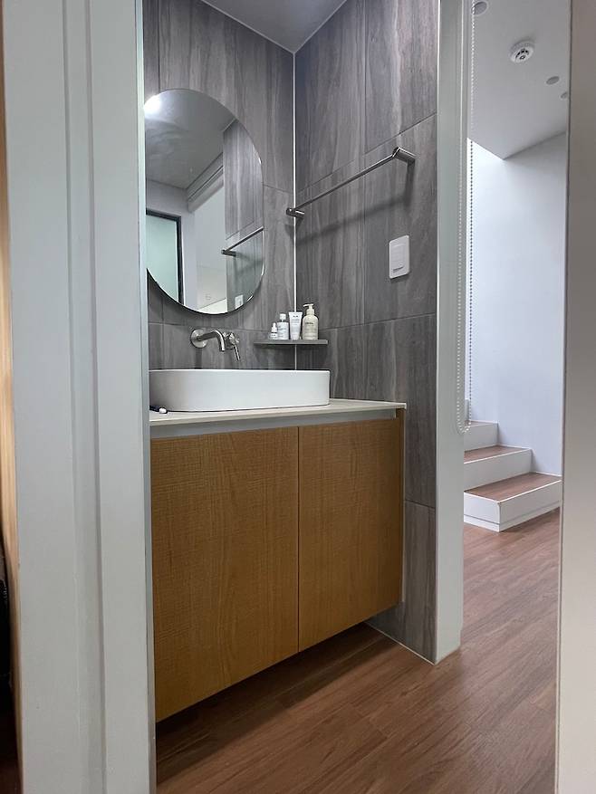 욕실에는 별도의 젠다이를 만들지 않았어요. 대신 젠다이 역할을 할 수 있는 무타공 세면대와 넉넉한 공간의 무늬목 수납장을 설치했어요.