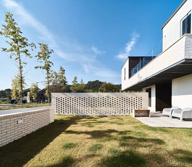 남은 공간에는 모두 잔디를 심었습니다. 마당 한가운데 벽돌을 조적하여 파티션을 만들었어요.