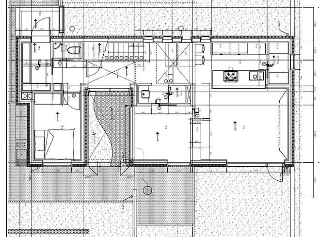 위에 사진을 보시면 저희 집은 (컨테이너가 있는 쪽) 현관 레벨이 '0'이고, 거실 주방 레벨이 '-350mm'이에요. 아울러 거실과 연결되는 마당의 레벨도 그만큼 낮아요. 이렇게 설계한 이유를 소장님은 '외부 시선이 차단되는 아늑한 공간 조성'이라고 하셨습니다. 실제로 마당에 있으면 사방이 감싸고 있는 편안한 느낌을 받습니다.