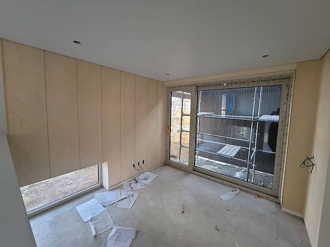 통상 단열을 생각하면 PVC가 좋다고 하고, 디자인을 생각하면 알루미늄이 좋다고 하죠. 고민이 될 수밖에 없는 부분이에요. 단열도 디자인도 모두 중요하니까요. 결국 저희가 선택한 제품은 이건창호 알루미늄 창호, 3중 유리에요. 외부 프레임은 회색으로, 내부 프레임은 베이지 컬러로 제작했고요. 유리색은 브론즈로 마감했습니다.