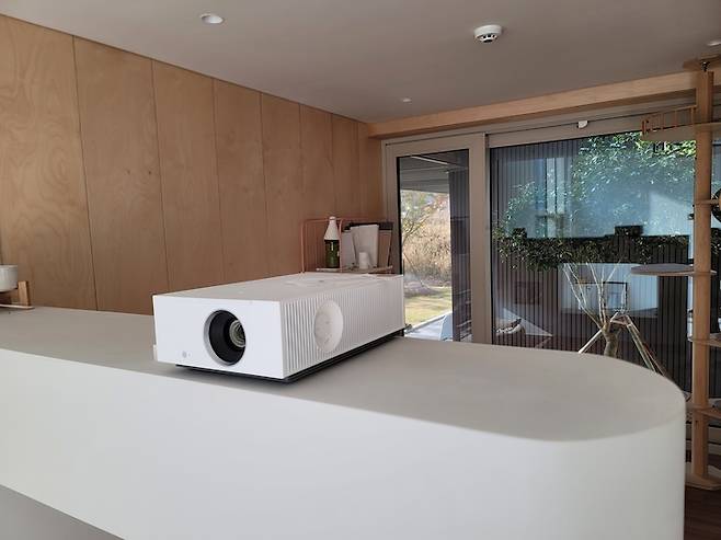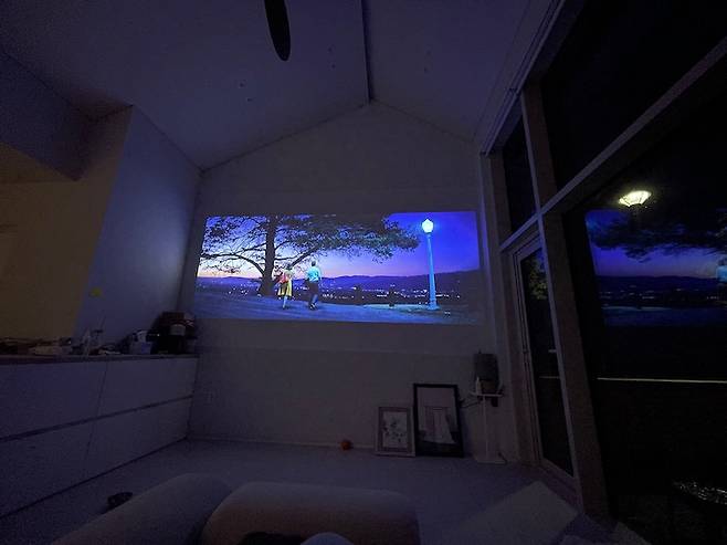 투사 거리가 5미터 정도로 꽤 긴 편이라 선택의 폭이 넓지는 않았어요. 몇몇 제품들 중에 결국 LG의 4K 제품을 설치했습니다. 화면 크기를 어지간히 키워도 화질이 아쉽지 않을 만큼 좋은 제품이에요. 별도의 기기 없어도 기본으로 OTT가 탑재되어 있어 와이파이만 되면 바로 사용이 가능합니다.