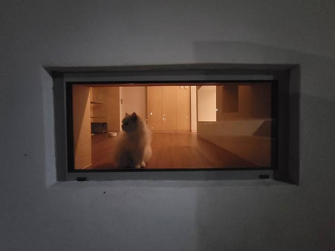 아래 사진은 반려동물의 눈높이에 맞춘 창이에요. 가끔 마당에 앉아 불멍하고 있을 때면 서로 눈이 마주칠 때가 있어요. 그럴 때마다 '창 하나 더 내길 잘했다' 하죠.