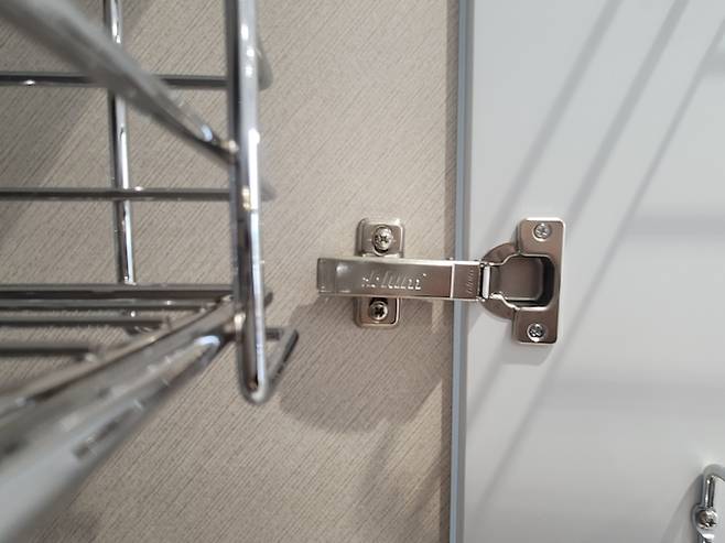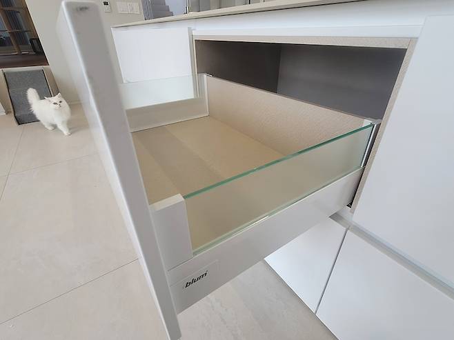 경첩과 레일은 모두 블럼 제품입니다. 누군가 그런 말을 하더라고요. 고급차와 보통차는 창문이 닫힐 때 보면 구분이 된다고요. 마지막에 서서히 닫히는 게 고급 차에만 있는 옵션이라고 해요. 이게 일본의 문 닫는 문화에서 비롯된 기술이라는데, 마지막에 문 닫히는 소리가 나지 않는 게 포인트라고 합니다.
