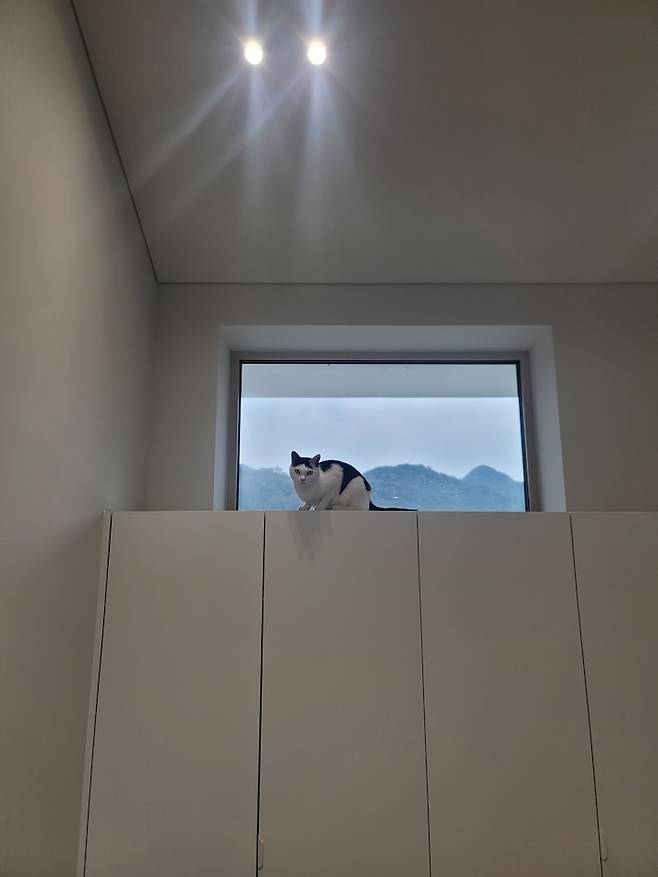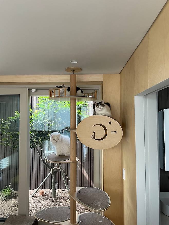 이렇게 설계한 이유는 '공간감' 때문이에요. 공간과 공간이 유기적으로 연결되는 느낌을 연출하고 싶었거든요. 그리고 고양이들이 마구마구 우다다하며 뛰어 다닐 수 있는 길게 쭉 뻗은 공간이 필요하기도 했습니다.