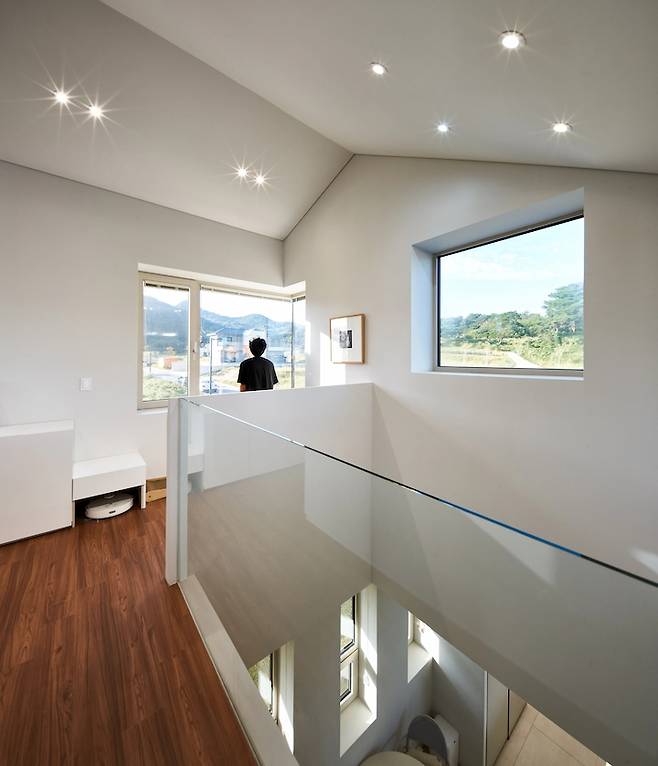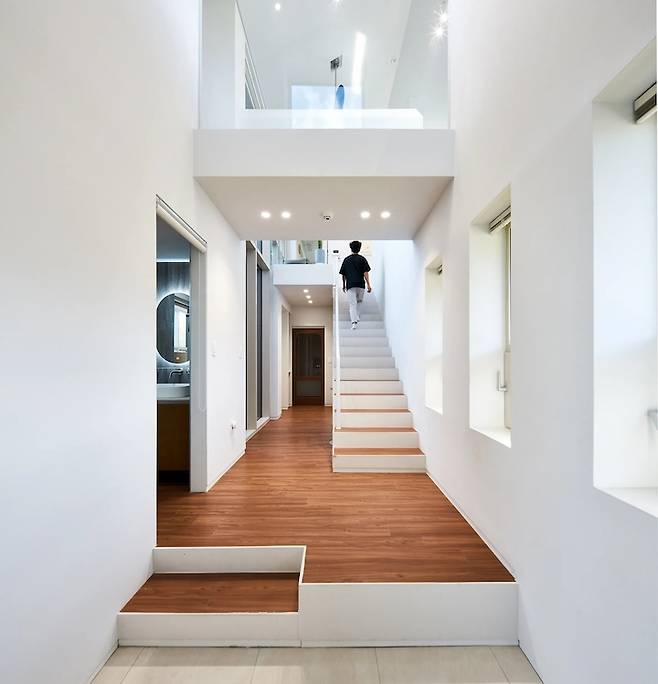 아래 사진은 1-2 층을 관통하는 보이드(void) 공간이에요. 집의 가장 낮은 곳과 가장 높은 곳을 연결합니다. 복도장 마지막 칸과 계단 밑에는 로봇청소기를 매립 할 수 있게 작업하였어요. 청소기 주차장입니다 : )