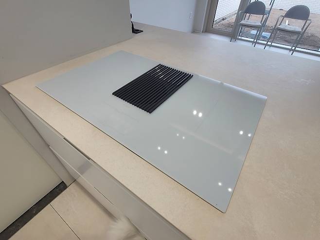 엘리카 니콜라 테슬라 인덕션이에요. 제품명은 '리브라' 입니다. 저울이 내장 돼 있어서 붙여진 이름이에요. 넓지 않은 주방이다 보니 천장에 후드가 나와있으면 답답해 보일 것 같아서 '후드 일체형 인덕션'을 선택했어요.