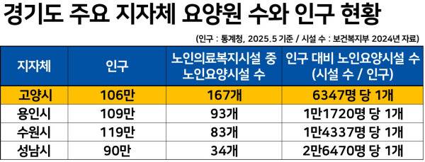 수치로도 나타난다. 보건복지부에 따르면 고양시 소재 노인요양시설이 167개로, 수도권 기초자치단체(시·군·구 단위) 중 최대 수준이다. 2014년 78개였는데, 10년 사이 2배 이상 늘었다.