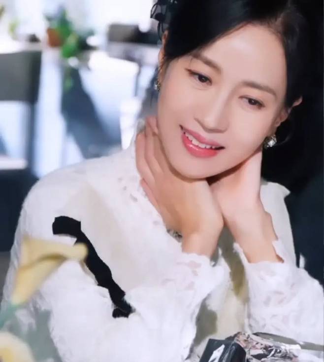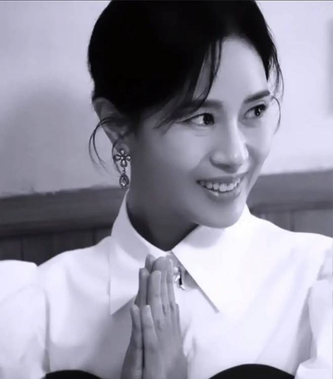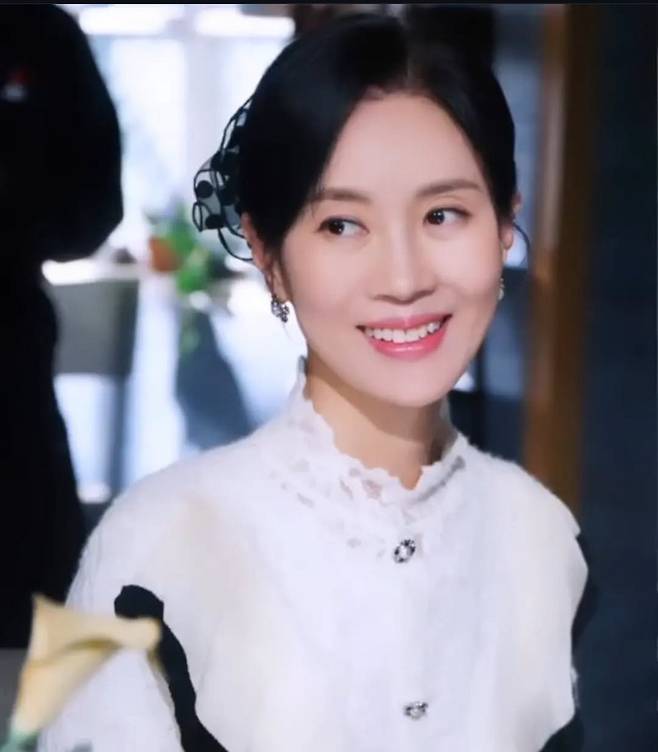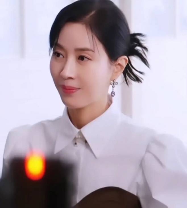 김희정은 고급스러운 레이스와 러플 디테일이 돋보이는 화이트 블라우스를 착용해 우아하면서도 클래식한 무드를 연출했습니다.