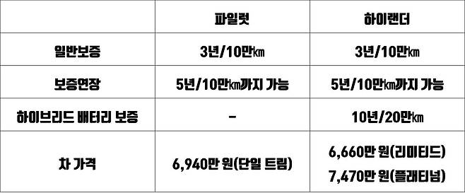 차 가격은 파일럿의 경우 6,940만 원짜리 단일 트림으로 나온다. 안전기술을 포함해 장비 수준이 크게 올라갔지만, 이전 세대보다 900만 원 가까이 올랐다는 점은 다소 아쉽다. 하이랜더는 두 가지 트림으로 나누는데, 기본 모델은 6,660만 원, 상위 트림은 7,470만 원이다. 옵션 차이가 있는 만큼 고민이 필요하다. 헤드업 디스플레이와 2열 열선, 파노라믹 뷰 모니터 등에서 차이가 있다.