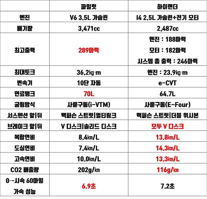 하이랜더 역시 이전엔 6기통 가솔린 엔진을 사용했으나, 신형은 하이브리드 시스템을 탑재했다. 엔진과 3개의 전기 모터, 배터리를 조합해 시스템 최고출력 246마력을 뿜는다. 파일럿에 비해 출력은 43마력 낮지만, 연비 차이는 확실하다. 복합 13.8㎞/L로, 파일럿(8.4㎞/L)보다 5㎞/L 이상 높다. 또한, 브레이크는 앞뒤 모두 벤틸레이티드 디스크를 적용해 안전성을 키웠다. 하이랜더 역시 사륜구동 시스템이 기본이다. 다만, 차이가 있다면 하이랜더의 AWD는 하이브리드 모델에만 들어가는 E-Four 시스템이다. 트랜스퍼 케이스가 없고, 뒤 차축의 전기 모터가 필요에 따라 뒷바퀴를 굴리는 시스템이다. 파일럿만큼 다양한 오프로드 주행모드는 없지만, 사륜구동 탑재로 인한 연비저하가 크지 않다. 또한, 모터 개수가 많아 회생제동을 통해 거둬들이는 에너지의 양도 상당하다.