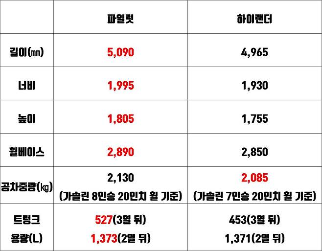 다만, 체격이 큰 만큼 몸무게는 많이 나간다. 2,130㎏으로, 하이랜더보다 45㎏ 무겁다. 이는 연비에 영향을 미칠 수밖에 없다. 적재공간 차이는 흥미롭다. 3열 시트 뒤 용량은 파일럿이 527L, 하이랜더가 453L로 혼다가 한층 여유롭다. 반면, 2열 시트 뒤 공간은 2L 차이로 거의 동일하다. 즉, 이번 파일럿의 ‘벌크업’은 주로 리어 오버행에 집중했다는 사실을 알 수 있다.