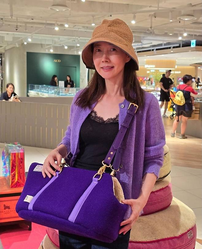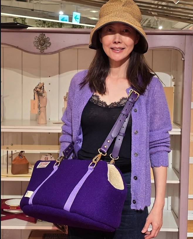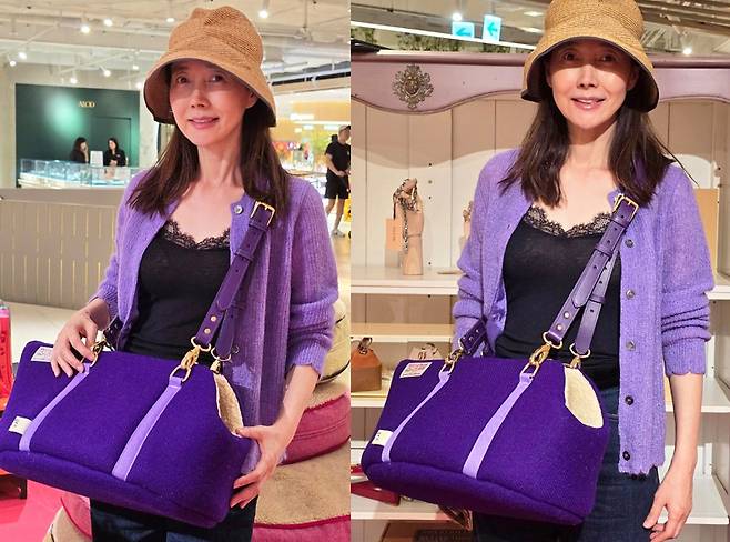 특히 강수지는 브라운 버킷햇과 보라색 슬링백을 활용해 실용적이면서도 우아한 포인트를 주었습니다.