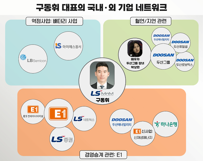 구 대표는 LS MnM 대표이사직 외에도 E1·LS네트웍스 사내이사, LS증권 기타비상무이사 등을 역임하며 중요한 의사 결정에 참여하고 있다. 이 중에서도 구 대표의 입김이 유독 강하게 작용하는 곳은 바로 가업이나 다름없는 ‘E1’이다. LS그룹의 지배구조는 그룹 2세 삼형제가 각각 LS, 예스코홀딩스, E1 등의 중간지주사격 기업을 나눠서 지배하는 형태인데 구 대표의 부친인 구자열 LS그룹 이사회 의장이 최대주주(12.78%)에 올라 있는 기업이 바로 E1이다. 구 대표 역시 E1 지분 5%를 소유 중이다. E1은 LS네트웍스, E1컨테이너터미널, LS증권 등을 자회사로 두고 있다.