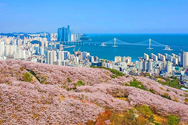 벚꽃이 흐드러지게 핀 4월 초에는 등산객뿐만 아니라 사진을 찍으러 오는 방문객들로 북적입니다. 정상에서는 벚꽃뿐만 아니라, 부산의 탁 트인 도심과 광안대교, 해운대 바다까지 한눈에 내려다볼 수 있습니다.